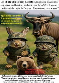 Les idiots utiles européistes œuvrent à la guerre en Ukraine, ravis de payer la facture ! Et vous, vous reconnaissez-vous en eux ? À qui profite cette guerre ou crèvent des Slaves, et qui précarise l'Occident ? La peau de l'Ours n'est pas à vendre. Pas une arme, pas un soldat, pas un euro pour la cobelligérance contre la Russie qui n'est pas notre ennemi ; Macron et Van der Leyen, si ! |